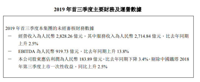 經營收入 2828.3 億元人民幣,其中服務收入 2714.8 億元,比去年同期上升 2.5%。