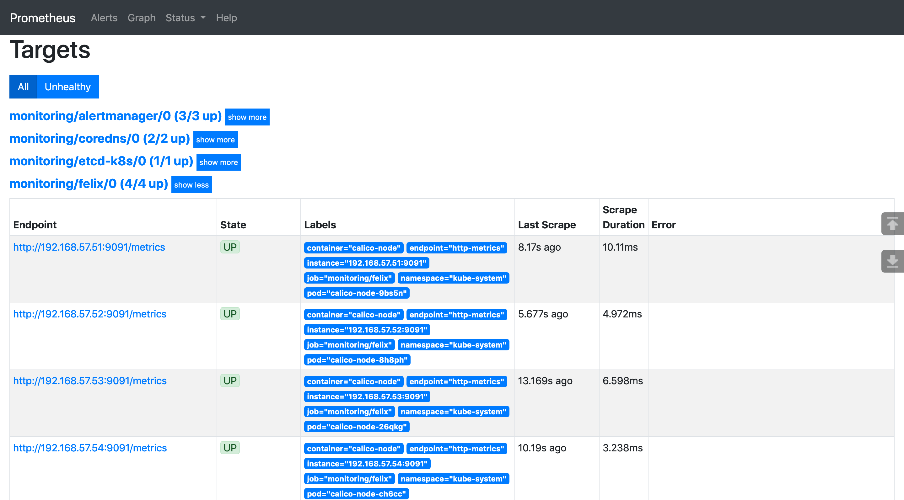 $ calicoctl patch felixConfiguration default --patch '{"spec":{"prometheusMetricsEnabled": true}}'