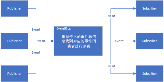我們知道事件是由一個Publisher跟一個或多個的Subsriber組成,但是在實際的使用過程中,我們會發現,Subsriber必須知道Publisher是誰才可以註冊事件,進而達到目的,那這其實就是一種耦合,為了解決這個問題,就出現了事件總線的模式,事件總線允許不同的模塊之間進行彼此通信而又不需要相互依賴,如下圖所示,通過EventBus,讓Publisher以及Subsriber都只需要對事件源(EventData)進行關注,不用管Publisher是誰,那麼EventBus主要是做了一些什麼事呢?