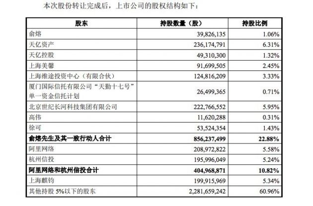 公告內容显示,本次股份轉讓事項實施完成后,阿里網絡、杭州信投作為一致行動人, 將持有公司 10.82% 的股份,上海麒鈞將持有公司 5.34% 的股份。本次權益變動前,公司控股股東為天億資產,持有上市公司 355,520,705 股股份,占上市公司股份總數的 9.50%,俞熔先生及其一致行動人合計持有上市公司1,407,586,139 股股份,占上市公司股份總數的 37.61%,俞熔先生為上市公司的實際控制人。