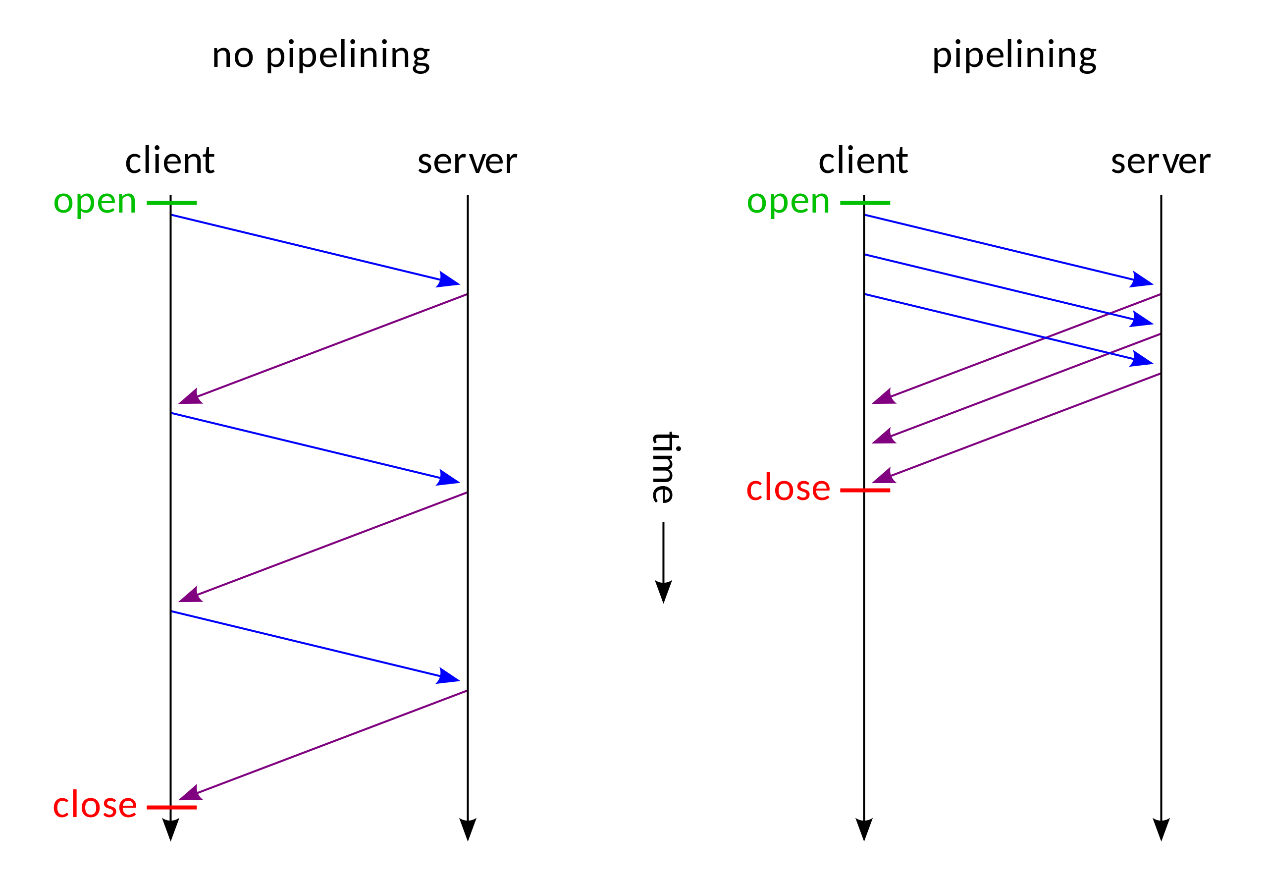Pipelining:能一次處理多個請求,客戶端不必等到上一個請求的響應后再發送下一個請求。服務器那邊一次可以接收多個請求,需要遵循先入先出機制,將請求和響應嚴格對應起來,再將響應發送給客戶端
