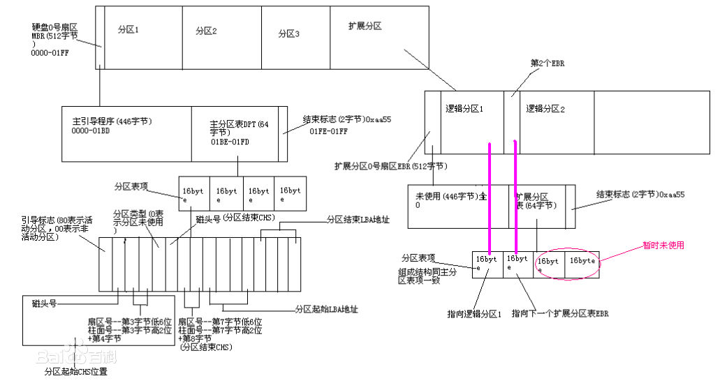 MBR中緊跟在主引導程序后的主分區表這64字節(01BE~01FD)中包含了許多磁盤分區描述信息,尤其是01BE~01CD這16字節,包含了分區引導標誌bootid、分區起始源頭beghead、分區起始扇區relsect、分區起始柱面begcy1、操作系統類型systid、分區結尾磁頭endhead、分區結尾扇區begsect、分區結尾柱面begcy1、分區扇區起始位置relsect、分區扇區總數numsect。