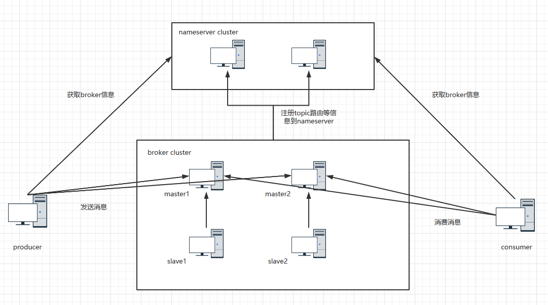 Broker:通過提供輕量級的topic和queue機制來存儲消息。與nameserver中的每個節點建立長連接,定時註冊topic等信息到nameserver上面。broker一般都是主從模式,因為消息是真實存儲消息的地方,避免一個結點掛了,導致這個節點數據全部丟失。