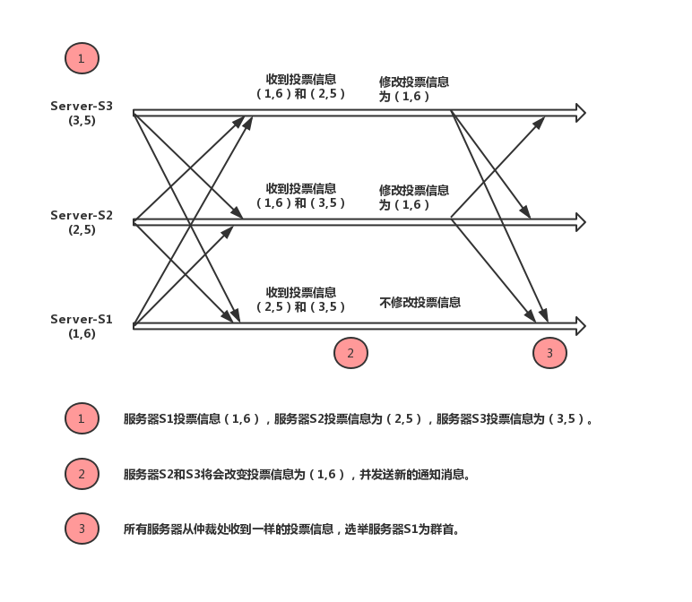 通過例子來演示選舉過程,三台服務器在分別發送出不同的選舉投票信息,其投票值包含服務器的標識符和最新的zxid。每個服務器都會收到另外兩個服務器發送的投票信息,在第一輪之後,服務器S2和S3將會改變其投票信息為(1,6),之後服務器S2和S3在改變投票信息之後會發送新的通知消息,S1服務器在接收到仲裁數量的通知消息擁有一樣的投票信息,最後S1被選舉出為集群的群首。